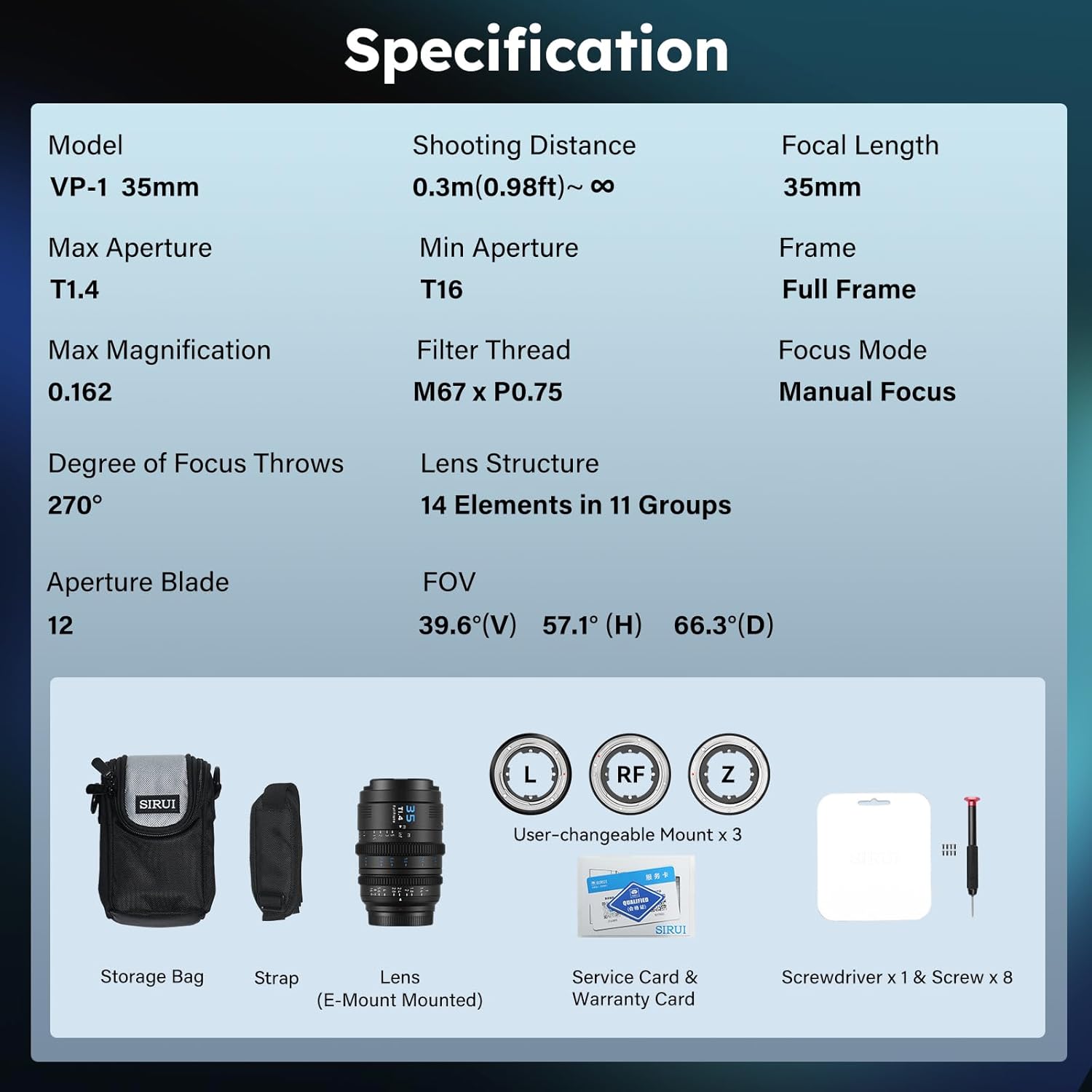 SIRUI VP-1 Vision Prime 1 T1.4 Full Frame Cine Lens, 35mm Manual Focus Cinema Lens with Pre-Installed E Mount, Interchangeable RF/Z/L Mounts (Black)